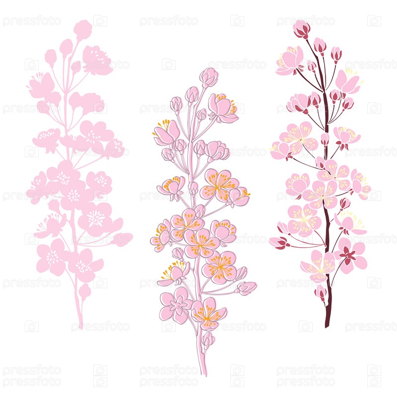 Цветущая ветка абрикоса. Векторная иллюстрация трех различных изолированных элементов дизайна. Нарисованные вручную цветочные элементы на белом фоне