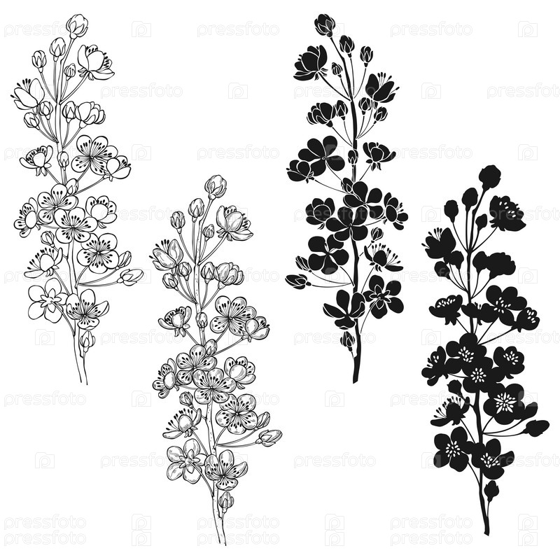 Цветущая ветка абрикоса. Векторная иллюстрация четырех различных изолированных элементов дизайна. Нарисованные вручную цветочные элементы на белом фоне