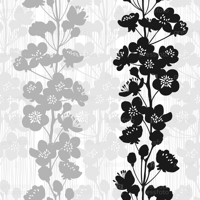 Бесшовный узор с цветущими ветвями абрикоса. Векторная иллюстрация. Цветочные силуэты. Идеально подходит для шаблонов дизайна, обоев, упаковки, ткани и текстиля