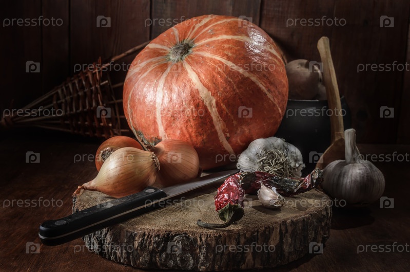 Тыква и другие овощи на темном деревянном фоне