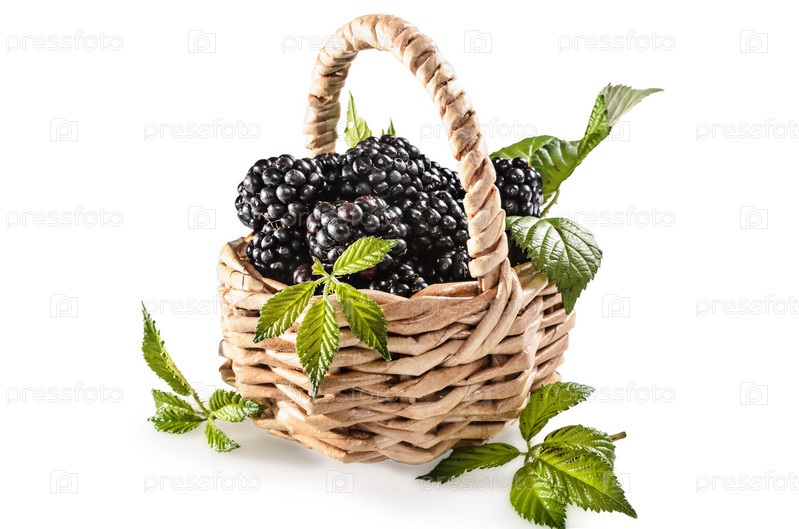 Спелая ежевика с листьями на белом фоне с мягкой тенью