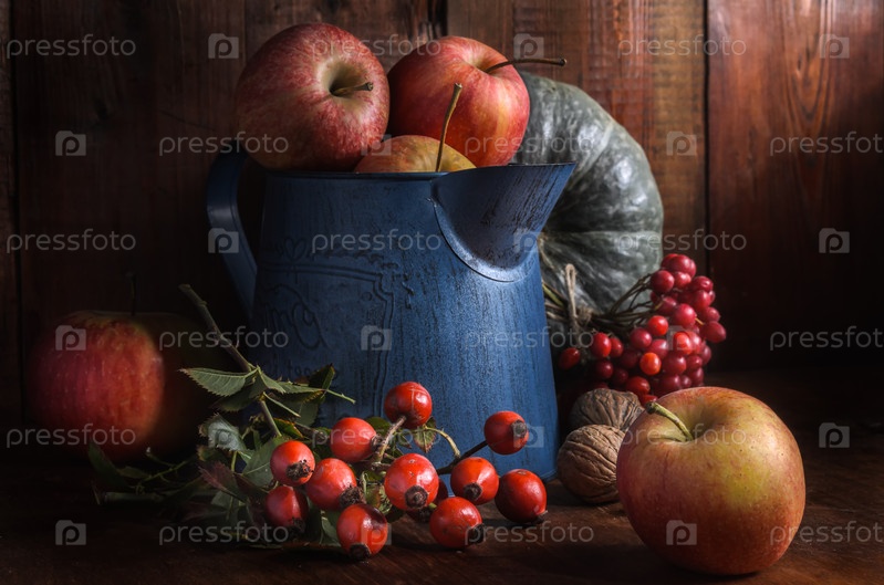 Яблоки в садовом кувшине на темном деревянном фоне в деревенском стиле