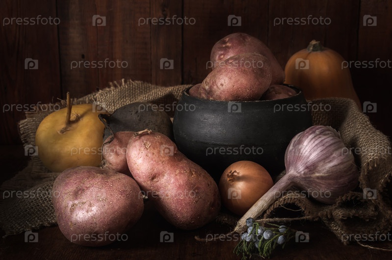 Спелые клубни картофеля и другие овощи на темном деревянном фоне в деревенском стиле