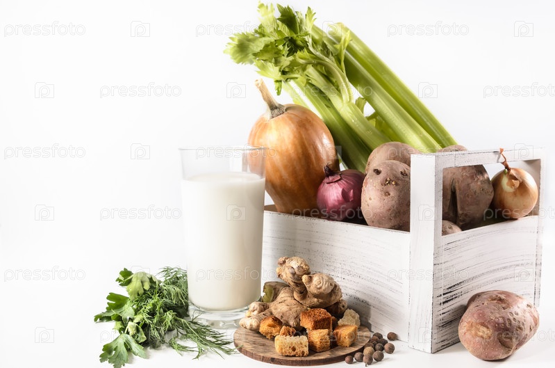 Тыква, сельдерей и другие ингредиенты для тыквенного супа с панировочными сухарями на светлом фоне
