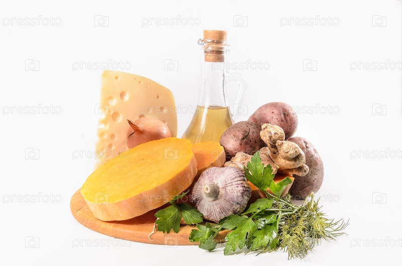 Тыква и ингредиенты для тыквенной запеканки с сыром на светлом фоне