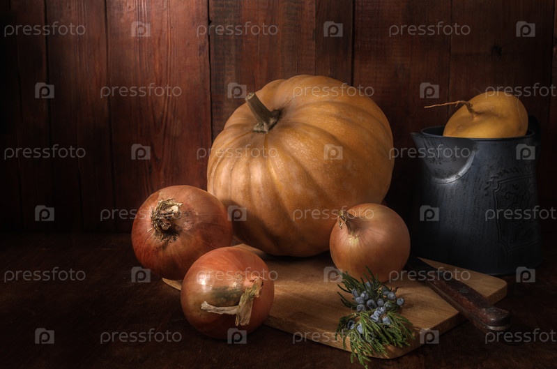 Тыква и другие овощи на темном деревянном фоне в деревенском стиле