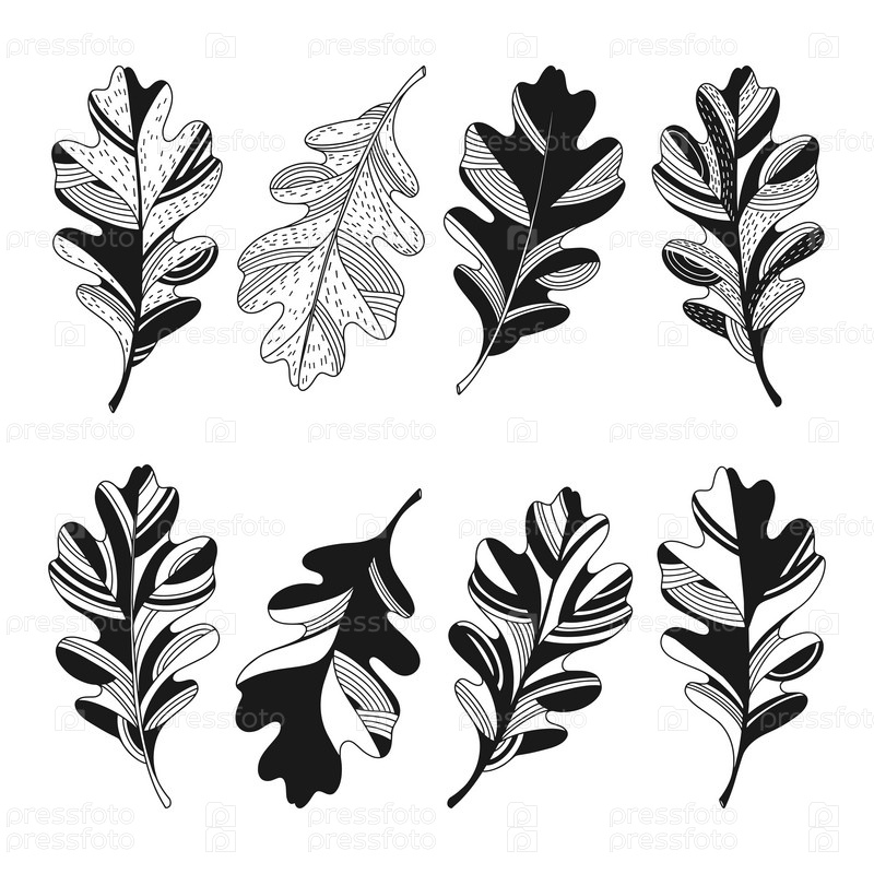 Восемь мультяшных дубовых листьев. Изолированные элементы на белом. Вектор. Идеально подходит для шаблонов дизайна, обоев, упаковки, ткани и текстиля