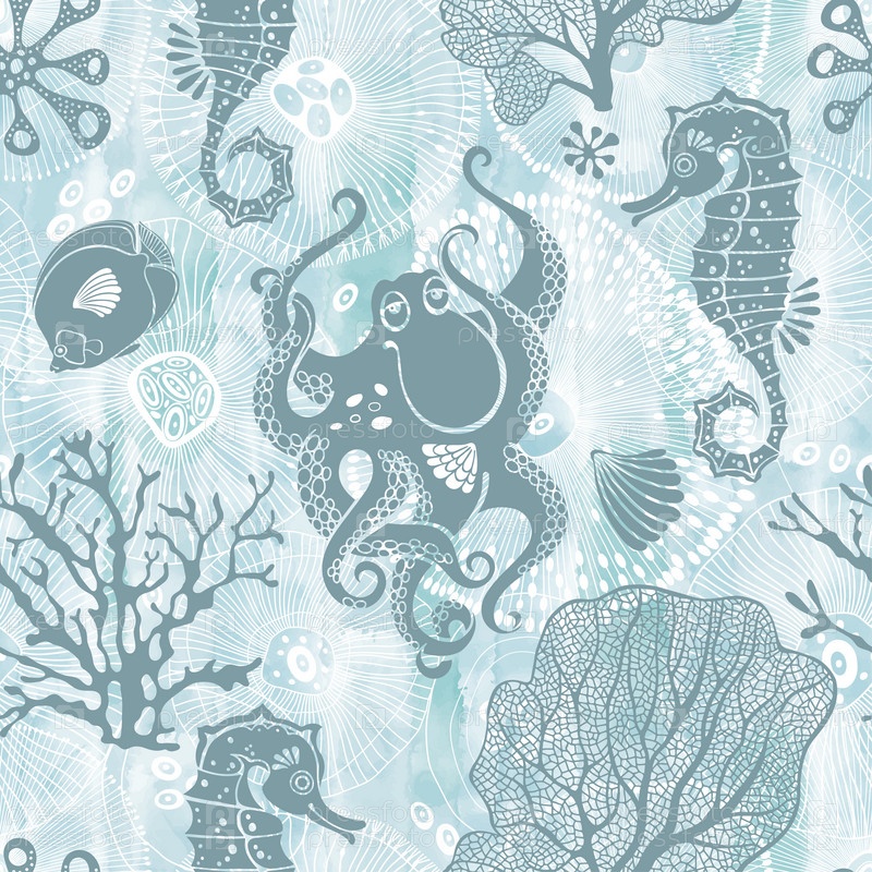 Подводный мир. Мультфильм бесшовные модели с морскими существами и растениями. Векторная иллюстрация на синем акварельном фоне. Идеально подходит для шаблонов дизайна, обоев, упаковки, ткани и текстиля