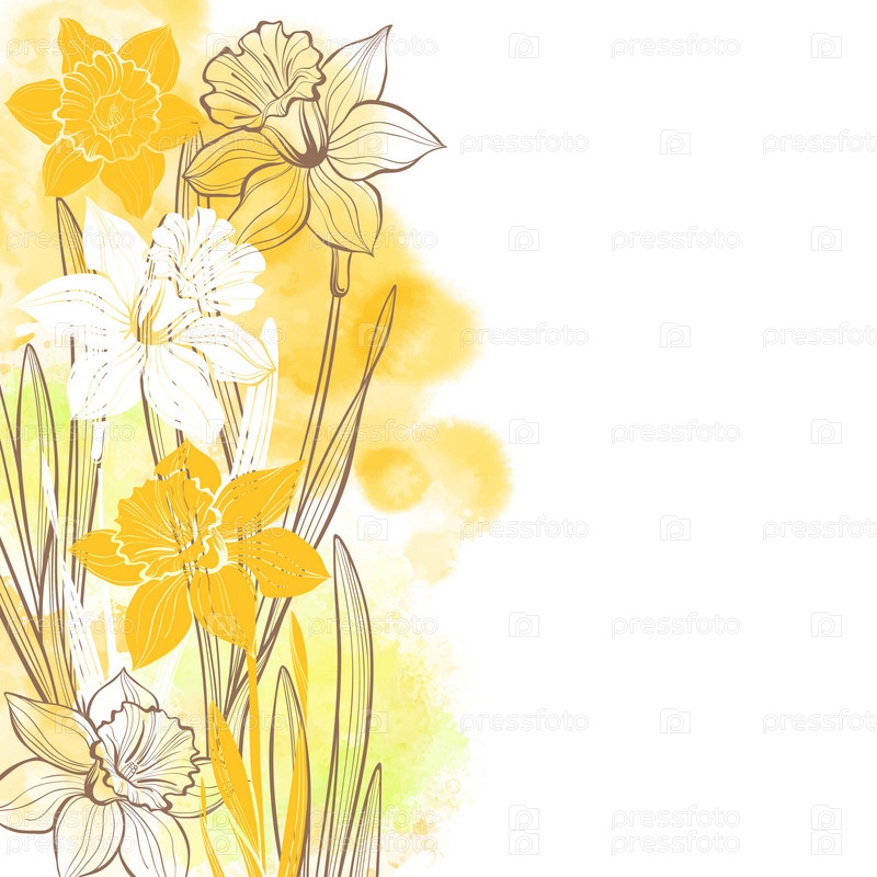 Цветочный дизайн с цветами нарцисса на желтом акварельном фоне. Векторная иллюстрация с местом для текста. Поздравительная открытка, приглашение или отдельные элементы дизайна. Вертикальная композиция