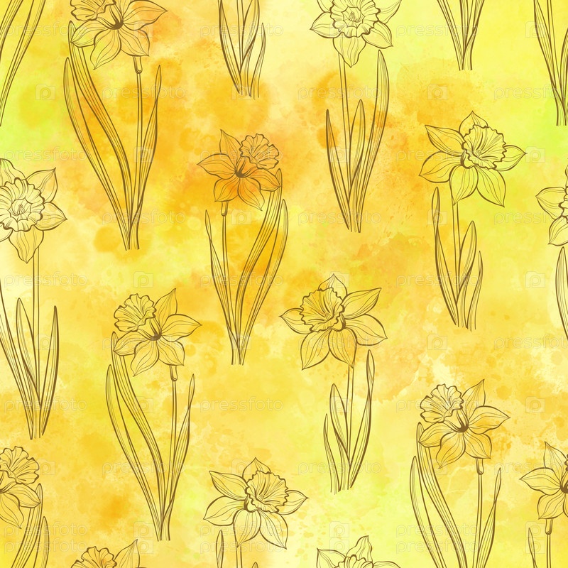 Бесшовный рисунок с нарциссами на желтом акварельном фоне. Фон цветочного искусства. Идеально подходит для шаблонов дизайна, обоев, упаковки, ткани и текстиля