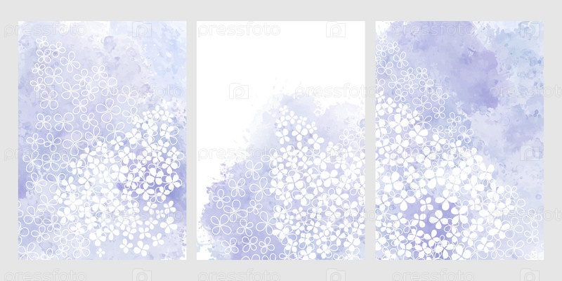 Готовый дизайн с сиреневыми цветами, очень-пери акварельным всплеском и местом для текста. Векторный макет декоративной открытки или приглашения дизайн фона, дизайн обоев. Три разные версии на весеннюю тему