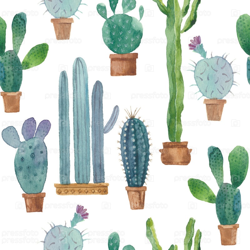 Бесшовный акварельный узор с кактусами на белом. Фон цветочного искусства. Идеально подходит для шаблонов дизайна, обоев, упаковки, ткани и текстиля
