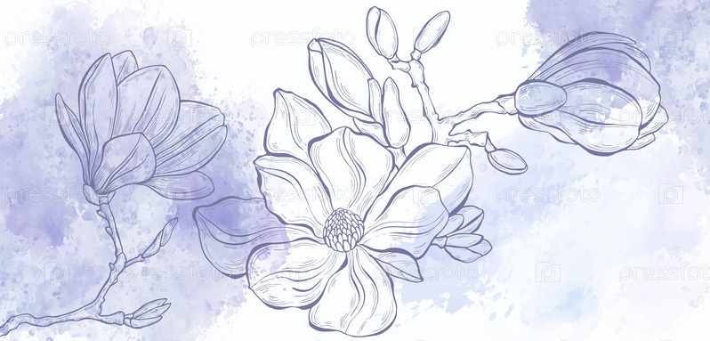 Художественный ботанический фоновый вектор. Роскошный дизайн с цветами магнолии и акварельным всплеском очень пери. Дизайн шаблона для текста, упаковки и печати