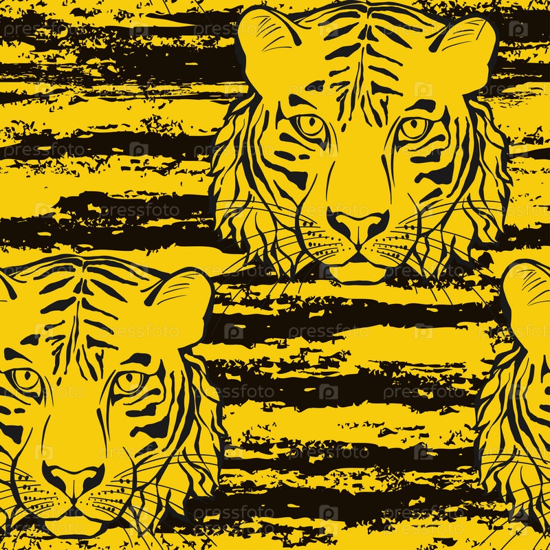 Бесшовный рисунок с тигровыми лицами и текстурными полосами. Ручная векторная иллюстрация. Фон искусства животных