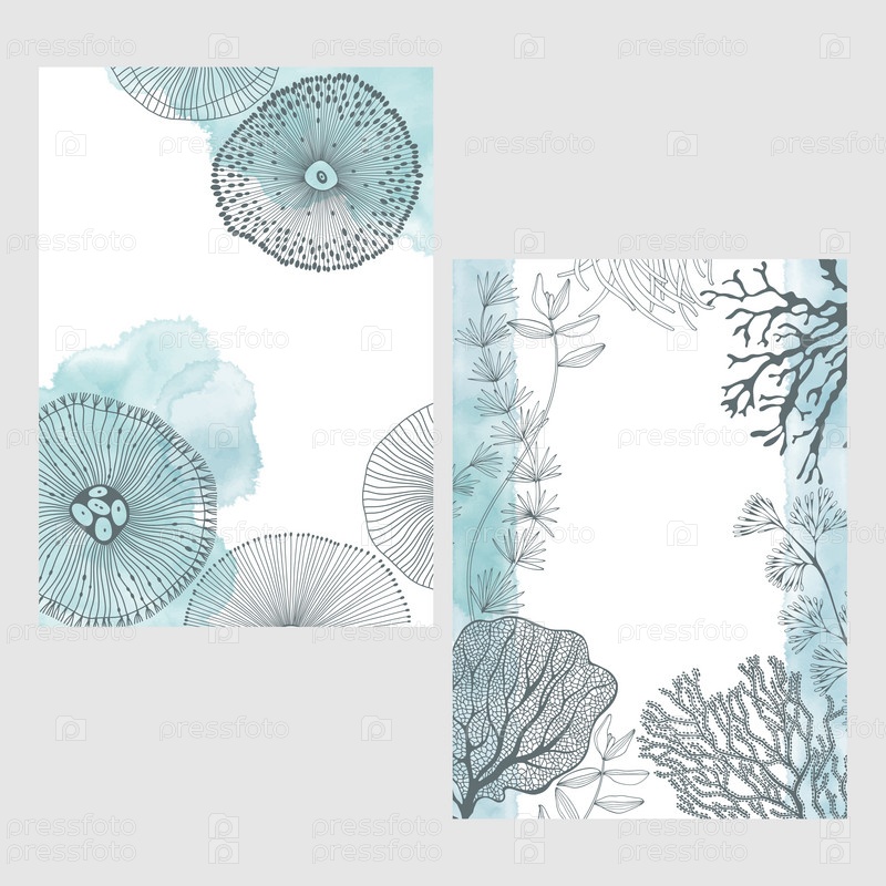 Набор карточек с водорослями, акварельными пятнами и местом для текста. Концепция морского орнамента. плакат, пригласить. Векторный макет декоративной поздравительной открытки или приглашения дизайн фона. Два разных варианта
