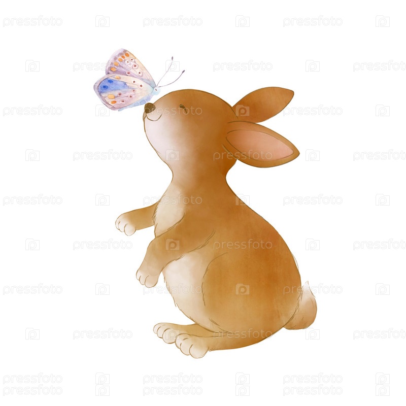 Очаровательный кролик и бабочка. Отдельные герои мультфильмов на белом фоне. Изолированные элементы акварели для дизайна