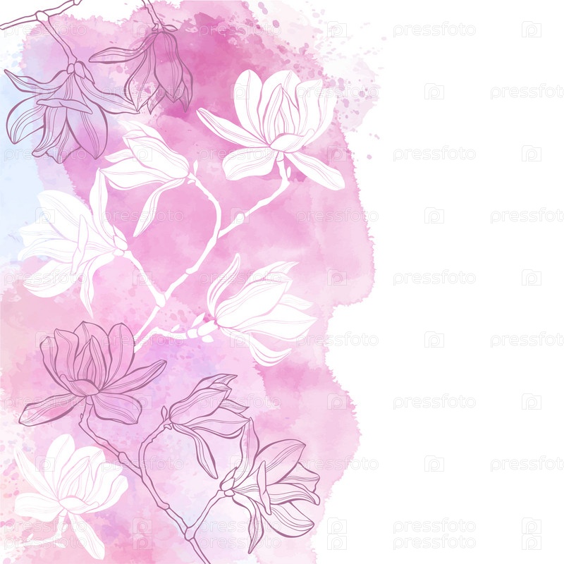Цветочный дизайн с магнолией на розовом акварельном фоне. Векторная иллюстрация с местом для текста. Поздравительная открытка, приглашение или отдельные элементы дизайна. Вертикальная композиция