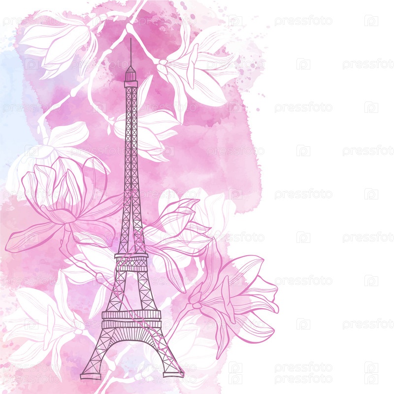 Весна в Париже. Векторная иллюстрация с Эйфелевой башней и цветущей магнолией на розовом акварельном фоне