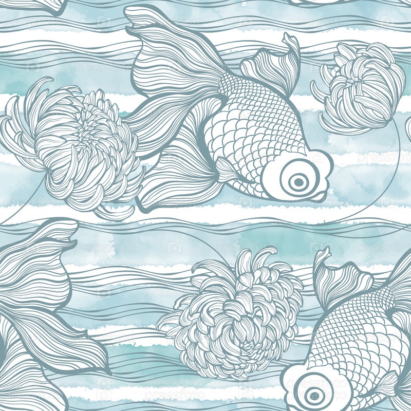 Хризантемы, рыбы и синие акварельные полосы на белом фоне. Бесшовный векторный рисунок. Фон искусства природы. Идеально подходит для шаблонов дизайна, обоев, упаковки, ткани и текстиля