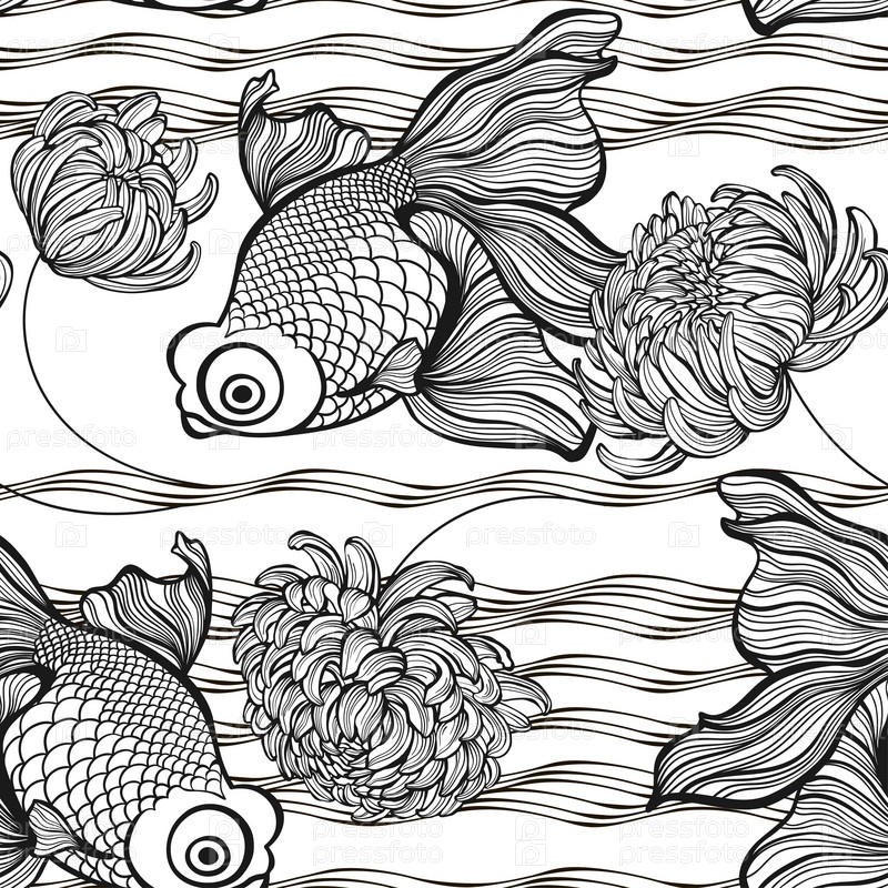Хризантемы и рыбы на белом фоне. Бесшовный векторный рисунок. Фон искусства природы. Идеально подходит для шаблонов дизайна, обоев, упаковки, ткани и текстиля
