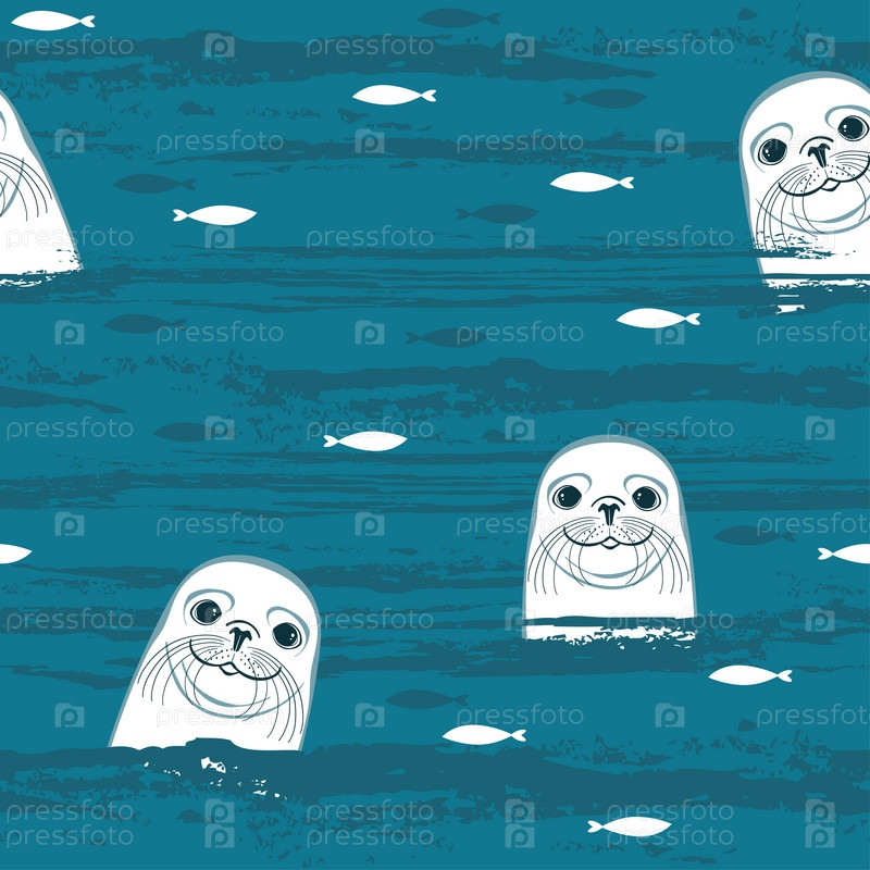 Тюлень, милое морское животное и маленькие рыбки. Бесшовный векторный рисунок. Идеально подходит для шаблонов дизайна, обоев, упаковки, ткани и текстиля