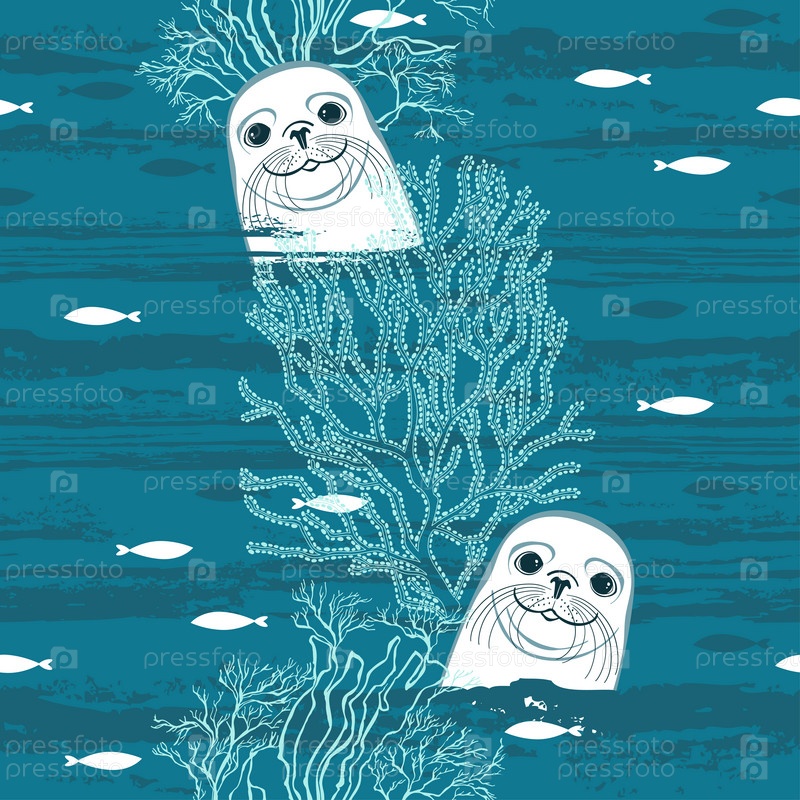 Тюлень, милое морское животное, водоросли и маленькие рыбки. Бесшовный векторный рисунок. Идеально подходит для шаблонов дизайна, обоев, упаковки, ткани и текстиля