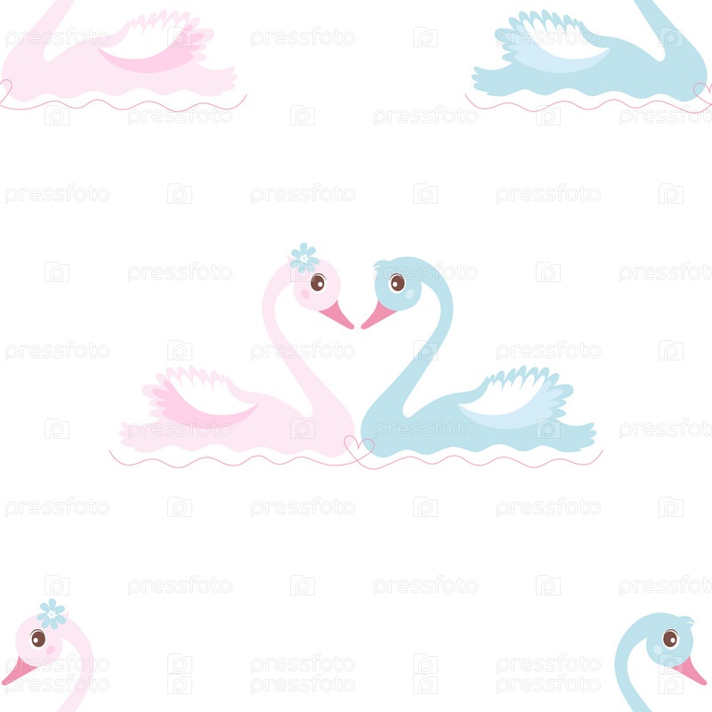 Бесшовный рисунок с лебедями. Романтический фон. Мультфильм векторные иллюстрации на белом. Приглашение на свадьбу, открытка. Идеально подходит для шаблонов дизайна, обоев, упаковки, ткани и текстиля