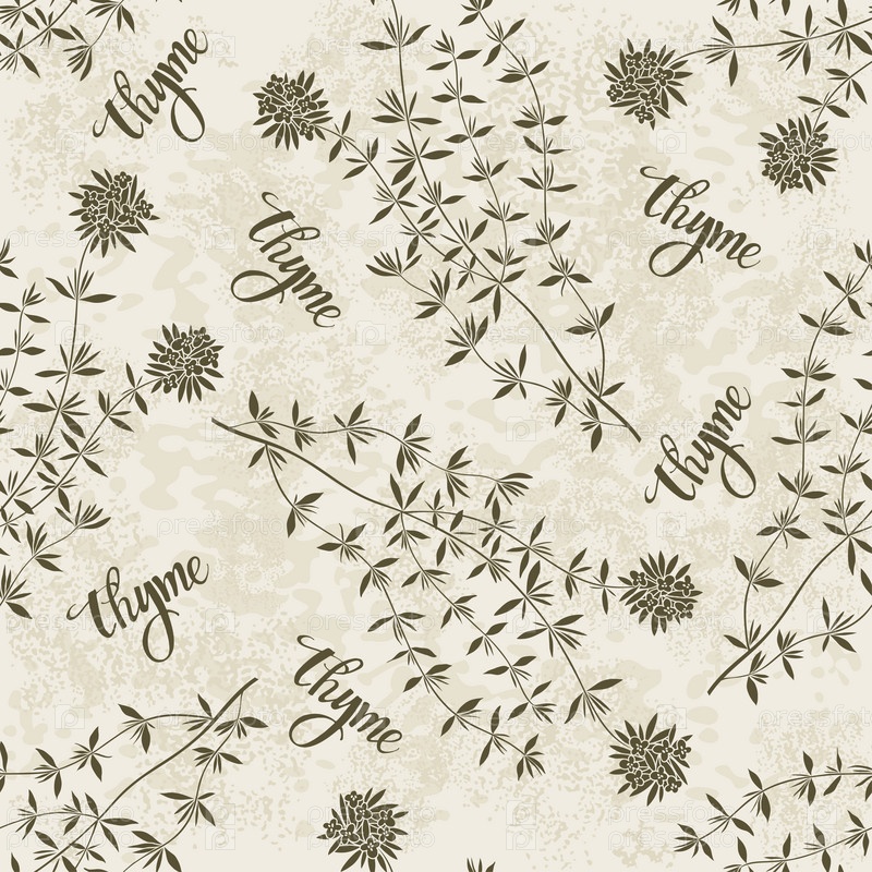 Тимьян. Бесшовный рисунок с пряными травами, надпись на текстурированном фоне. Монохромная векторная иллюстрация. Идеально подходит для шаблонов дизайна, обоев, упаковки, ткани и текстиля