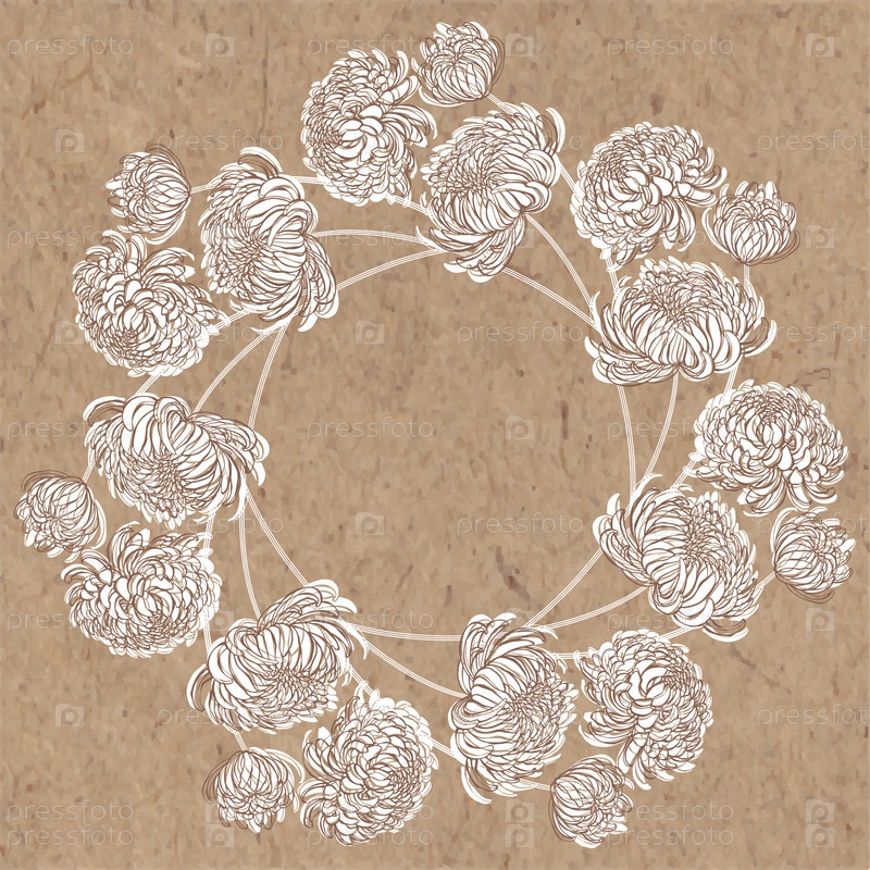 Цветы хризантемы. Вектор. Фон природы. Цветочный векторный венок с местом для текста на крафт-бумаге. Иллюстрация может быть использована для создания открытки, меню или пригласительного билета