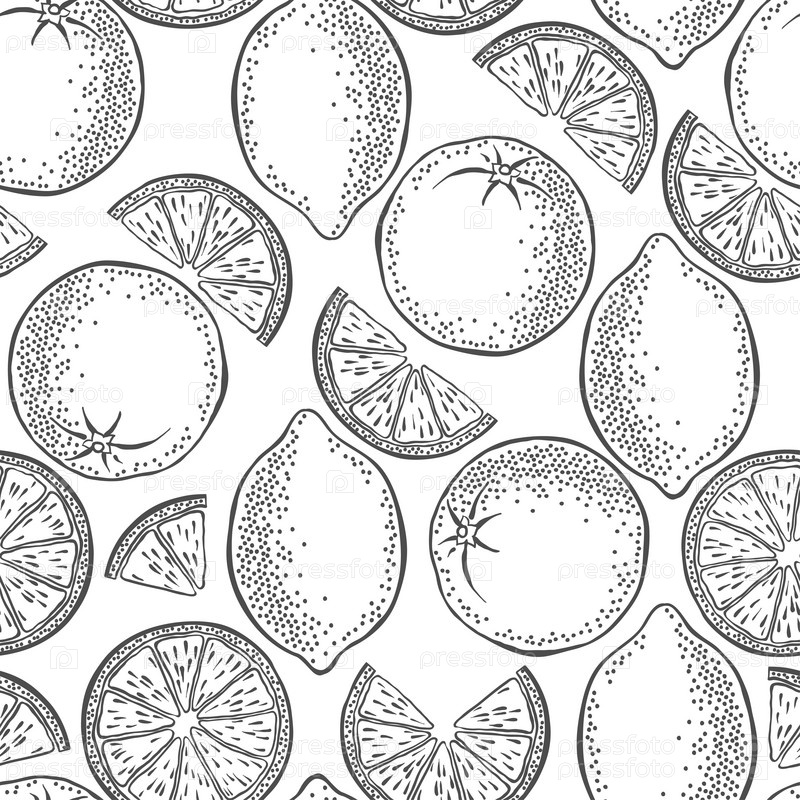 Натуральные витамины. Бесшовный векторный рисунок с цитрусовыми. Черно-белый пищевой фон. Идеально подходит для шаблонов дизайна, обоев, упаковки, ткани и текстиля