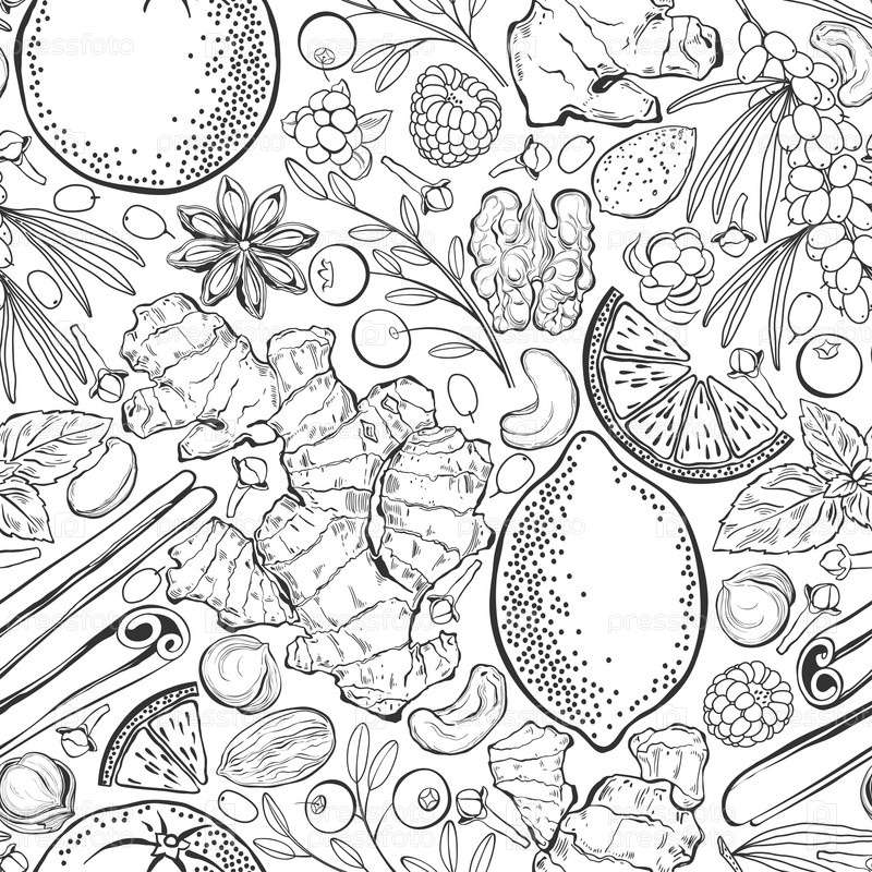 Натуральные витамины. Бесшовный векторный рисунок с фруктами, ягодами, орехами и специями, которые обогащают иммунную систему человека. Черно-белый пищевой фон