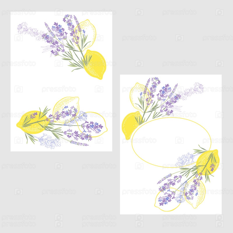 Набор открыток с лимонами и лавандой и место для текста. Концепция средиземноморского орнамента. плакат, пригласить. Векторный макет декоративной поздравительной открытки или приглашения дизайн фона. Два разных варианта