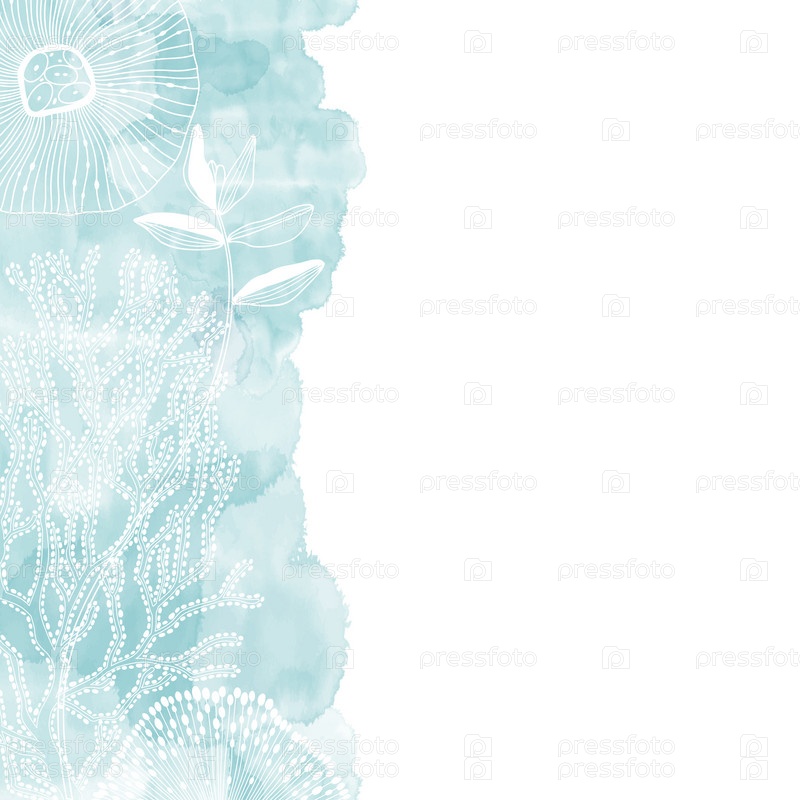 Векторная иллюстрация с нарисованными вручную морскими растениями и фрагментом синей акварели на белом фоне. Морской фон. Иллюстрация с пространством для текста может быть использована для создания открытки или пригласительного билета