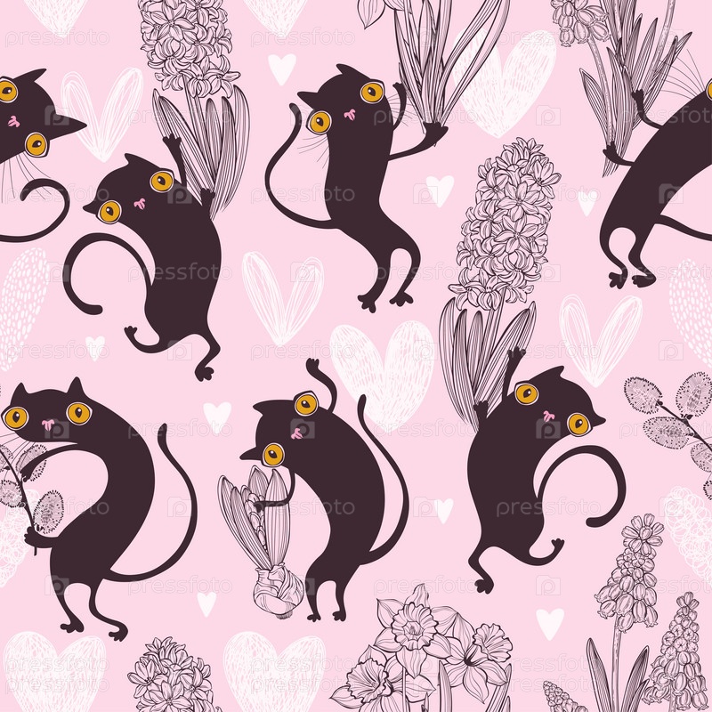 Очаровательные кошки с весенними цветами. Бесшовный узор на розовом. Вектор. Идеально подходит для шаблонов дизайна, обоев, упаковки, ткани и текстиля