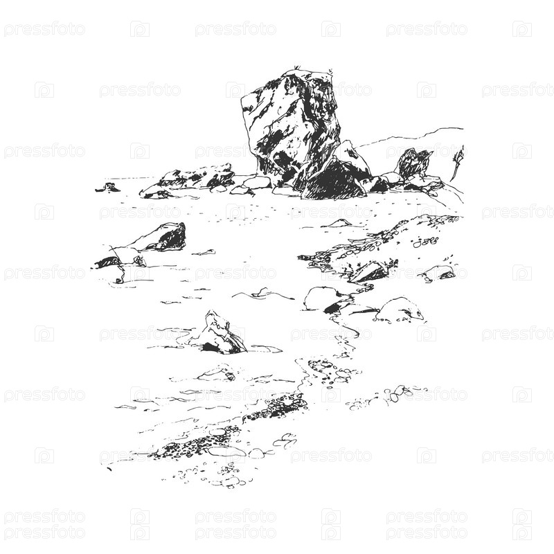 Морской пейзаж. Горы, скалы, морские камни, галька и море. Ручной рисунок на белом. Векторная реалистичная иллюстрация. Черное и белое