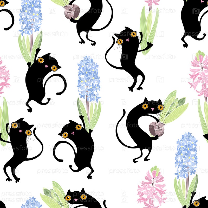 Очаровательные кошки с гиацинтами. Бесшовный узор на белом. Вектор. Идеально подходит для шаблонов дизайна, обоев, упаковки, ткани и текстиля