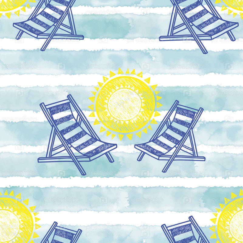 Вектор пляж бесшовный фон. Летний фон. Шезлонг, солнце и полосатый синий акварельный фон