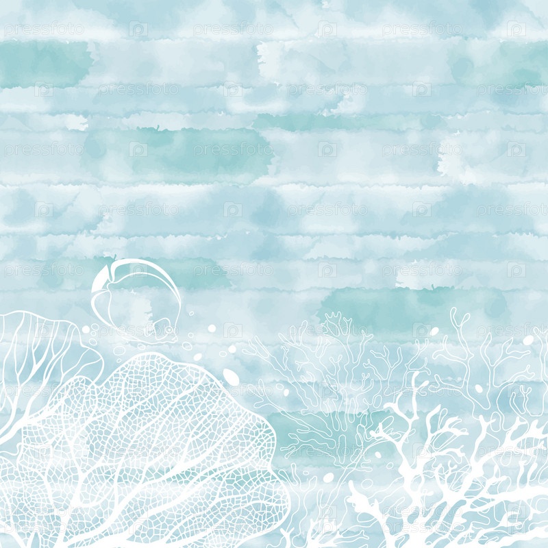 Кораллы и рыбы на синем акварельном фоне. Векторная иллюстрация с пространством для текста. Приглашение, поздравительная открытка или элемент вашего дизайна