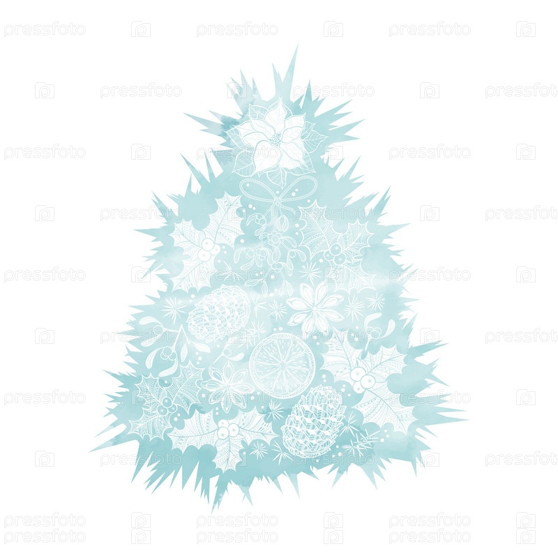 Белая рождественская елка с праздничными элементами композиции на синем акварельном силуэте. Идеальный элемент для праздничного оформления, открыток, приглашений