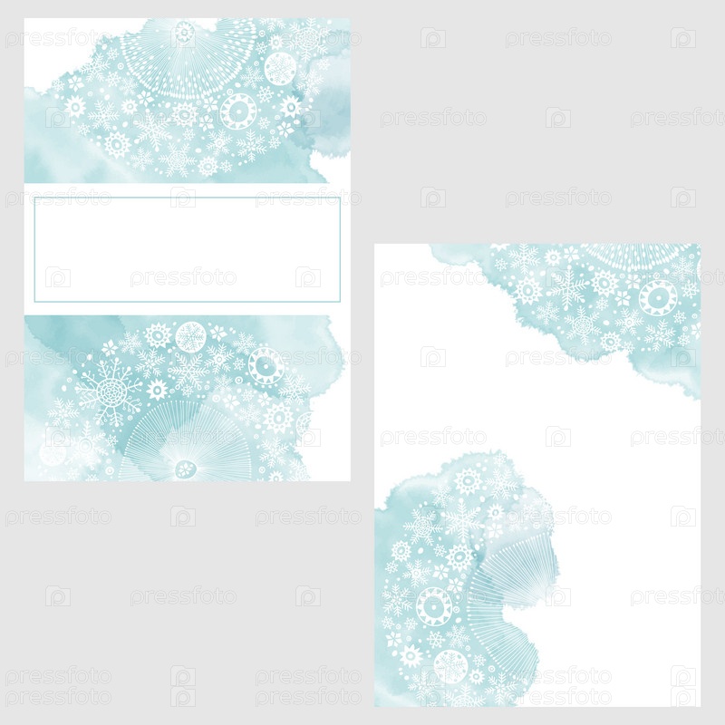 Набор открыток со снежинками, акварельными пятнами и местом для текста. Концепция праздничного зимнего орнамента. плакат, пригласить. Векторный макет декоративной поздравительной открытки или приглашения дизайн фона. Два разных варианта