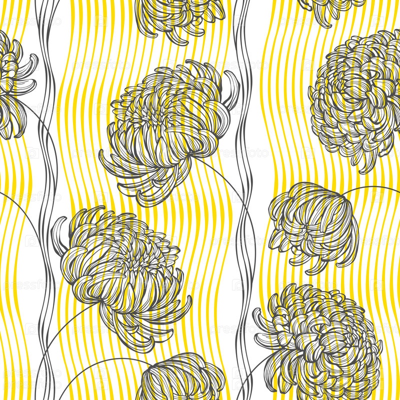 Хризантемы и желтые полосы на белом фоне. Бесшовный векторный рисунок. Цветочный фон. Идеально подходит для шаблонов дизайна, обоев, упаковки, ткани и текстиля