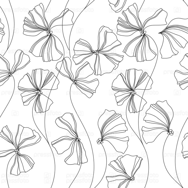 Бесшовный узор с цветами на белом фоне. Монохромная векторная иллюстрация. Цветочный фон. Идеально подходит для шаблонов дизайна, обоев, упаковки, ткани и текстиля