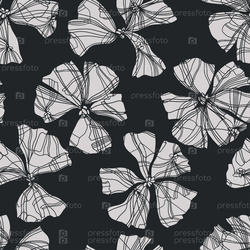 Бесшовный узор с абстрактными цветами на черном. Монохромная векторная иллюстрация. Цветочный фон. Идеально подходит для шаблонов дизайна, обоев, упаковки, ткани и текстиля