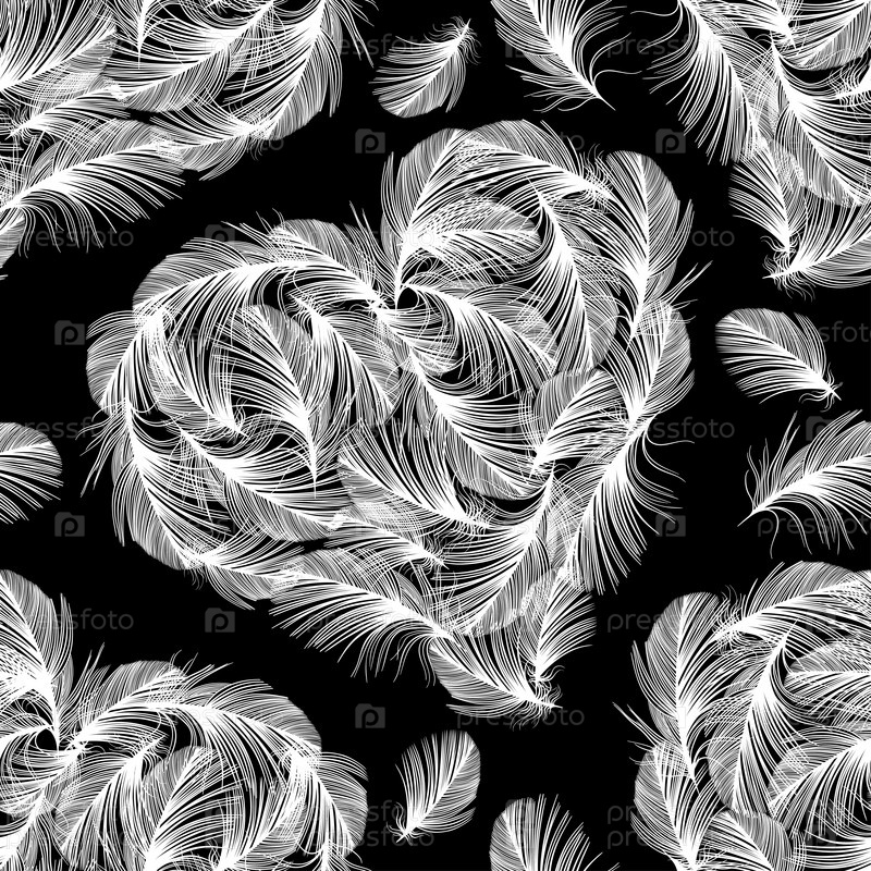 Пушистое сердце из перьев. Бесшовный векторный рисунок на черном фоне. Идеально подходит для шаблонов дизайна, обоев, упаковки, ткани и текстиля