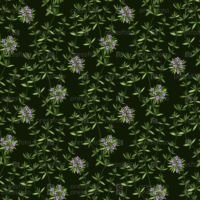 Тимьян. Бесшовный рисунок с пряными травами на черном. Цветная векторная иллюстрация. Идеально подходит для шаблонов дизайна, обоев, упаковки, ткани и текстиля