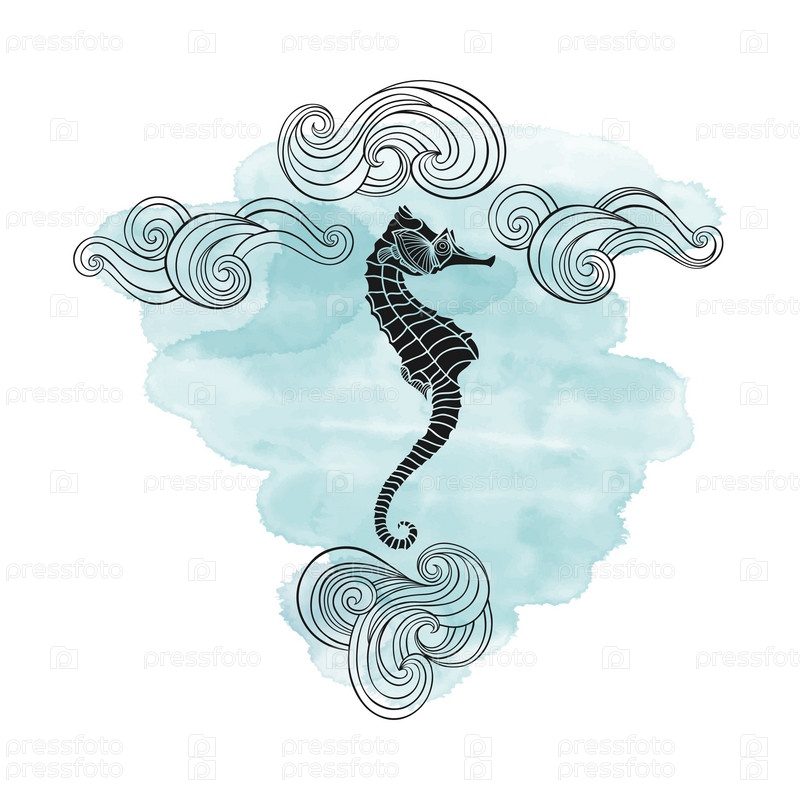 Морской фон с морским коньком и волнами. Векторная иллюстрация с синим акварельным элементом. Приглашение, поздравительная открытка или элемент вашего дизайна
