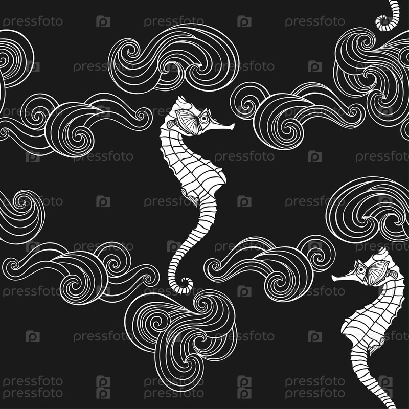 Морские коньки и волны. Бесконечный фон на морскую тему. Абстрактная векторная иллюстрация на черном. Идеально подходит для шаблонов дизайна, обоев, упаковки, ткани и текстиля