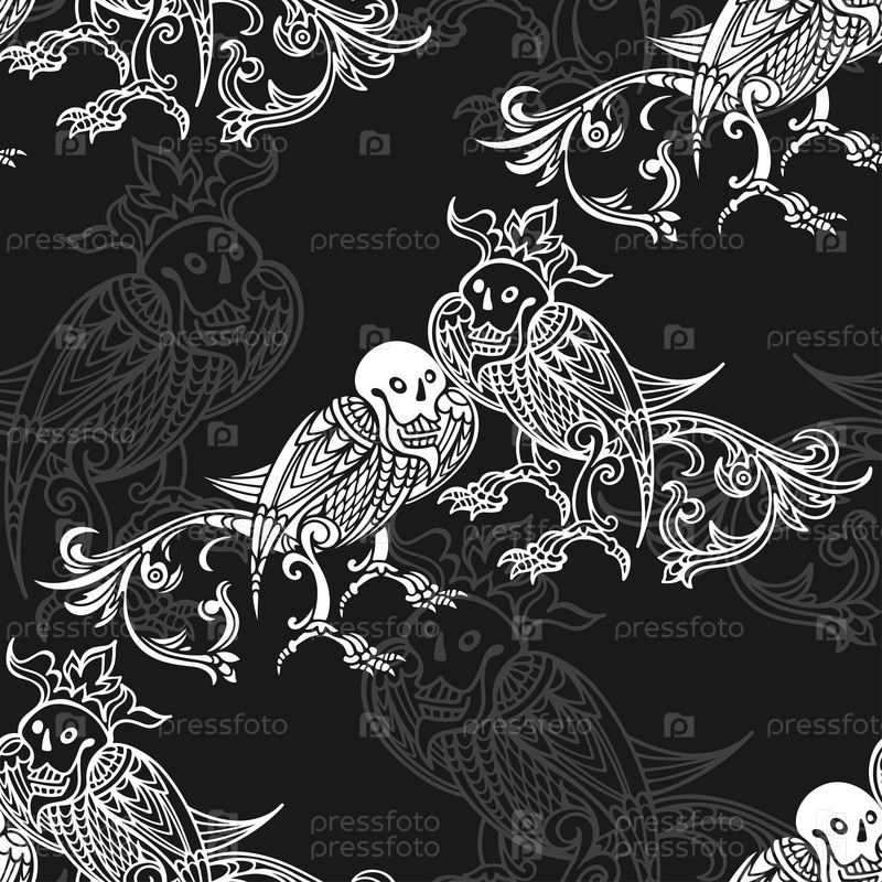 Бесшовный рисунок с мифическими существами. Черно-белый фон. Вектор. Идеально подходит для шаблонов дизайна, обоев, упаковки, ткани и текстиля