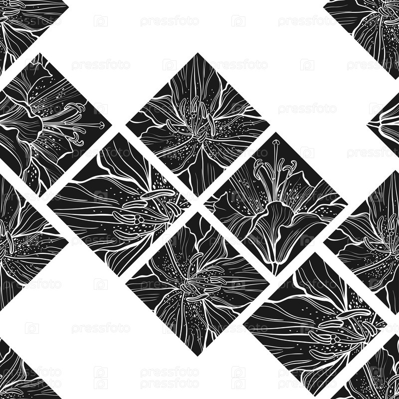 Цветочный геометрический фон с цветами лилии на белом. Абстрактный бесшовный рисунок. Вектор. Черное и белое
