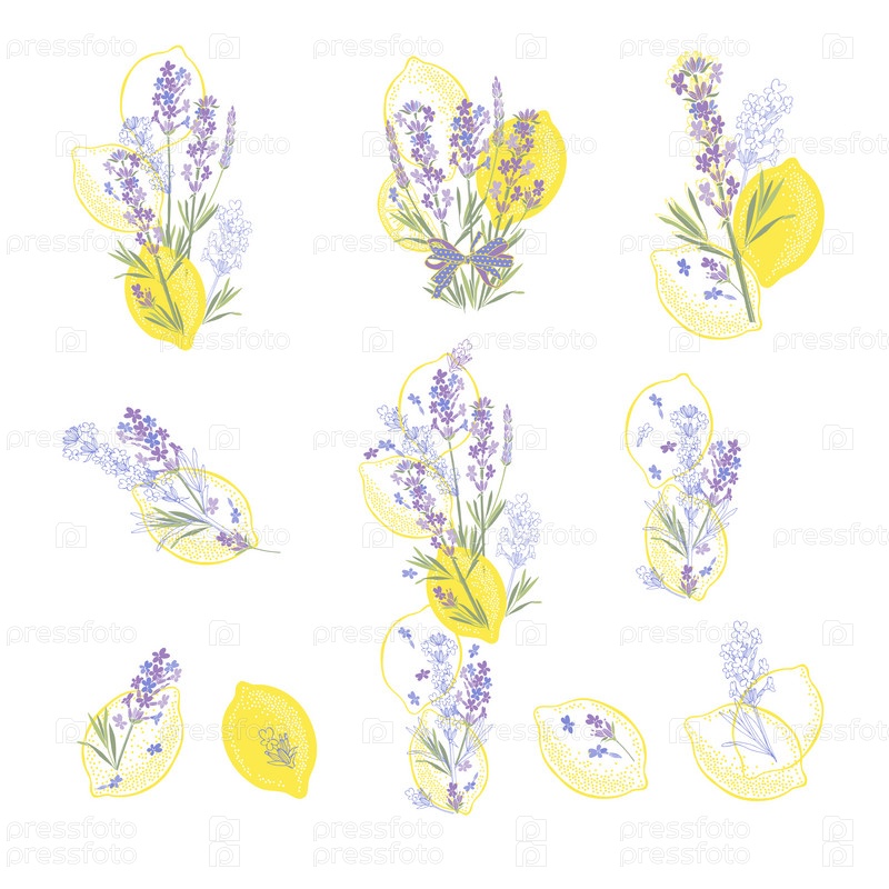 Лаванда и лимоны. Десять цветочных композиций. Векторная изолированная иллюстрация на белом. Идеально подходит для украшения меню, открыток, как отдельный элемент вашего дизайна